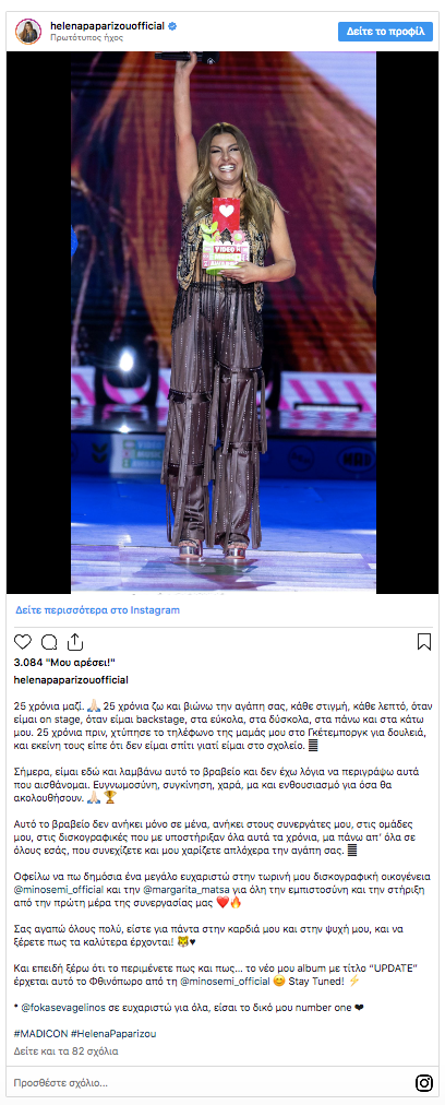 Στη λεζάντα της ανάρτησής της, η Έλενα Παπαρίζου γράφει: «25 χρόνια μαζί. 🙏🏻 25 χρόνια ζω και βιώνω την αγάπη σας, κάθε στιγμή, κάθε λεπτό, όταν είμαι on stage, όταν είμαι backstage, στα εύκολα, στα δύσκολα, στα πάνω και στα κάτω μου. 25 χρόνια πριν, χτύπησε το τηλέφωνο της μαμάς μου στο Γκέτεμποργκ για δουλειά, και εκείνη τους είπε ότι δεν είμαι σπίτι, γιατί είμαι στο σχολείο. Σήμερα, είμαι εδώ και λαμβάνω αυτό το βραβείο και δεν έχω λόγια να περιγράψω αυτά που αισθάνομαι. Ευγνωμοσύνη, συγκίνηση, χαρά, μα και ενθουσιασμό για όσα θα ακολουθήσουν 🙏🏻 🏆».
