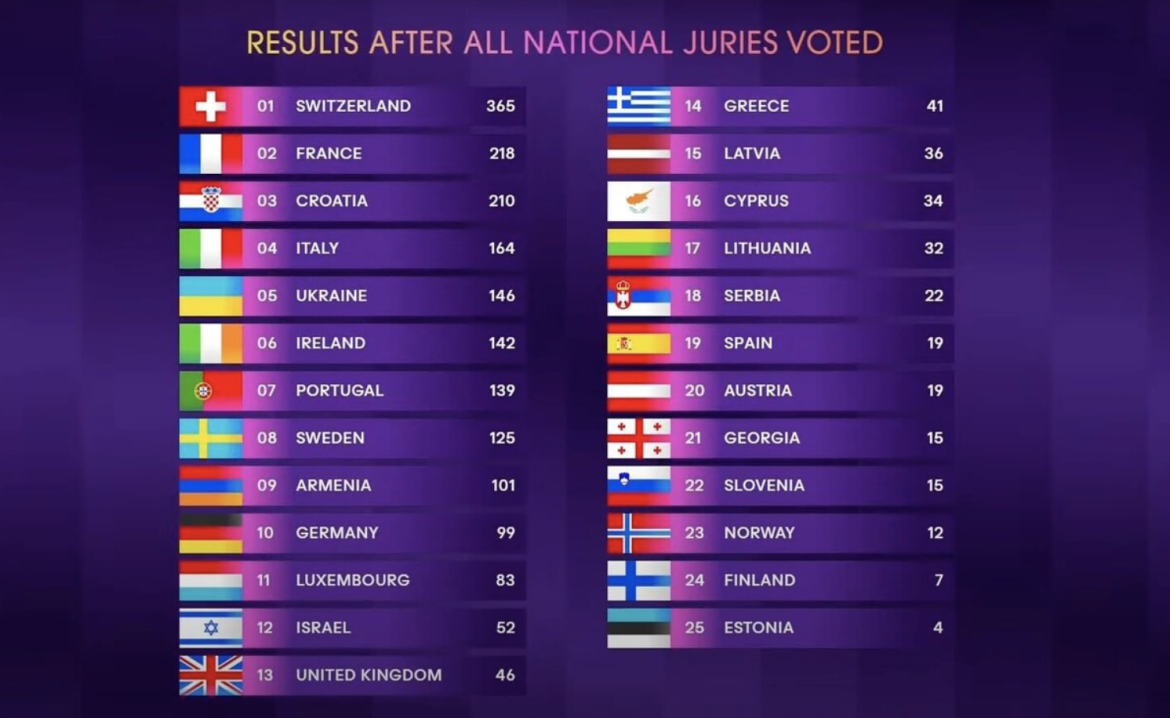 Η χθεσινή βραδιά, πάντως, είχε νικητή και δεν ήταν άλλος από το Nemo της Ελβετίας. Με το κομμάτι «The code», ο εκπρόσωπος έσπασε τον κωδικό και βρέθηκε στην κορυφή με 365 βαθμούς από τις επιτροπές και 226 βαθμούς από το κοινό. Στη δεύτερη θέση βρέθηκε το μέχρι πρότινος μεγάλο φαβορί, ο Baby Lasagna της Κροατίας, με 210 βαθμούς από τις επιτροπές. Το κοινό, όμως, τον τίμησε με 337 βαθμούς-την υψηλότερη βαθμολογία στη φετινή βραδιά. Όπως αποτυπώνεται, ο κόσμος ήθελε τον Κροάτη να σηκώσει την κούπα αλλά οι επιτροπές επιθυμούσαν κάτι διαφορετικό.