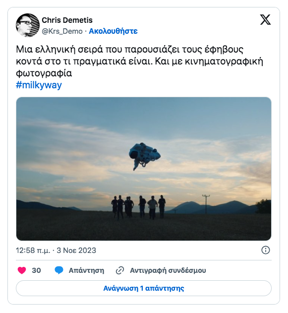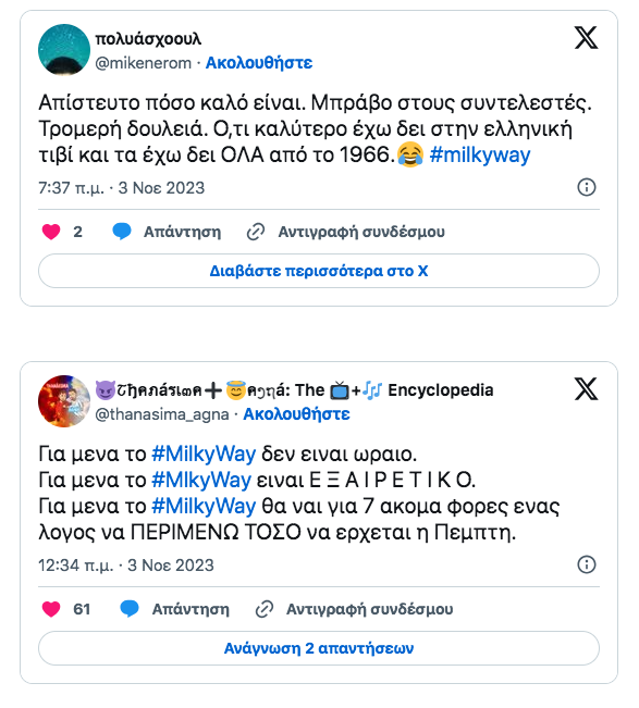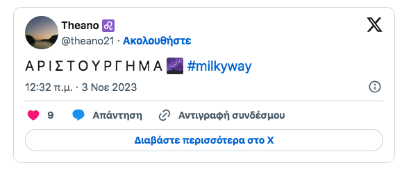 πηγη[https://www.protothema.gr/life-style/article/1431413/milky-way-enthousiase-i-premiera-to-xupnima-tis-ellinikis-tileorasis-sholiazoun-sta-social-media/]